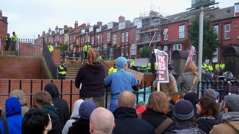 David Cameron came to Leeds and was welcomed by around 100 protesters. Just noon he drove into the Shine buisniess centre on Harehills Road to give a talk after being greeted with eggs, boos and graffiti from the night before. Undercover police were deployed but the protest was low key and they never sprang into action.