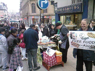 In conjunction with Veggies Vegan Catering Campaign, a group of animal rights activists took to the streets to offer Bradford shoppers a free taste of the alternative to McRubbish and KFCrap. Supported by a compelling arsenal of pizza, burgers and various cake - all made with the finest ethical (including strictly vegan) ingredients - the case was pitched for a kinder, more environmentally friendly and healthier diet.