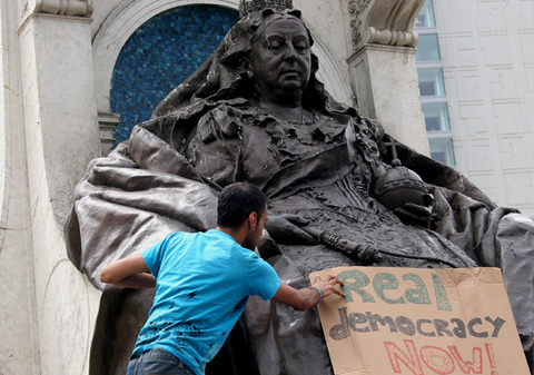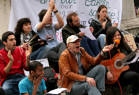 Demonstrators assembled in the city's Piccadilly Gardens as part of a spontaneous collective movement which, inspired by the Egyptian and Tunisian uprisings, started in Spain on the 15th May 2011 and soon spread to many cities both in Spain and abroad.