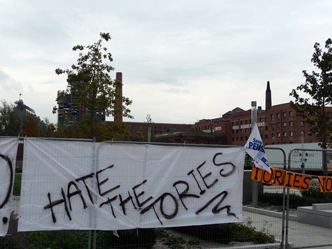 Today tens of thousands marched in protest at the tory party conference in manchester. A feeder march from the university started around 12.30pm after speeches setting out the reasons for the occupation of albert square and future dates for mobilising resistance to the cuts and the con-dem coalition. It joined the main protest which noisily snaked its way around the tory party conference centre. There was a huge amount of anger expressed by marchers with many saying they were inspired by events in other countries and were preparing to support the block the bridge action in london on 9th october, the education demos on 9th nov and the strikes on 30th Nov.