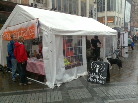 Anyone in Leeds today, head down to Briggate where IMC Northern England have put up a "Be the Media" centre from where people attending the mass action, due to take place at 3.50pm can publish their news. We are sharingour tent with the welcome desk for the event so come along to find out more about the many events that are happening throughout the city and around the world.