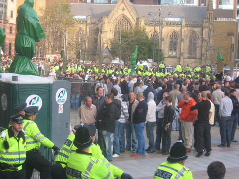 At 15:00 hours, 450 EDL protestors were kettled in city square to listen to talks and to chant. The EDL supporters had come from all over the UK to preach their message on the streets of Leeds. The atmosphere was reminiscent of a football hooligan riot, with fists, skinheads, and barely a woman or child to be seen. There were banners with slogans such as 'No to sharia law', 'Women are not posessions', and 'Extremist Islam big problem.' Members of the EDL occasionally tried to break out past the fences and the police, who were there in their hundreds on horses, with dogs, and on foot.