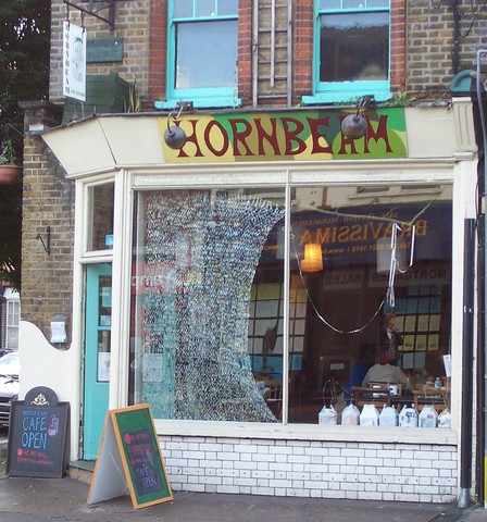 By the time the tour left Cambridge this morning there were 19 riders (and a few extra cyclists seeing us off) and the sun was out again. After a stop for more flag-poles at the cane shop we ploughed on through another brisk headwind, lunched at Ware, stocked up on horns for honking-enablement, and finally arrived - via cycle route 1, the Lea valley tow-path (five punctures and a premature return to the smooth tarmac and people-killer world of the main roads) - at the Hornbeam Centre for a tasty evening meal.