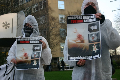 In Bradford, anti-vivisectionists held a noisy and visual demo at the University of Bradford to draw attention to their ongoing animal testing programme which has become under growing pressure to stop.
