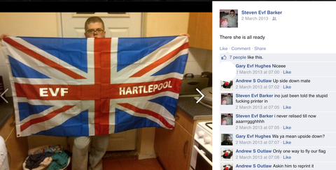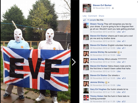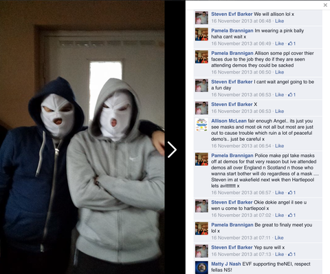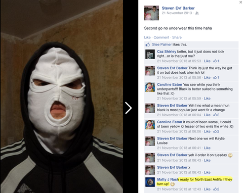 Today also unmasked are members of the EVF (English Volunteer Force) members in the North East of England ‘North East EVF’. So far it seems they’re mostly concentrated mostly in Hartlepool and consists of little more than a few nut jobs posing masked up in their house and garden.