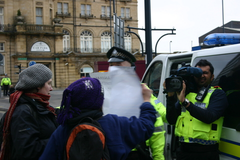 A march through the streets and up to the University building witnessed several arrests and what many regarded to be heavy handed policing tactics, as protestors were prevented from handing out leaflets to the public on several occasions and two were arrested for attempting to obscure the view of the FIT (Forward Intelligence Team) cameraman who was trying to film people attending the legal demonstration. Several small skirmishes ensued causing a high level of tension between the Police and demonstrators.