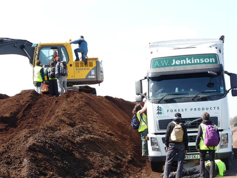 Earth First activists shut down Peat Bog extraction at Chat Moss in Greater Manchester. They entered the site at 10.30 am, locked onto a lorry and digger which was being used to remove peat from the site. As of 2pm two activists were still locked onto the vehicles, with around 5 cops in attendance.