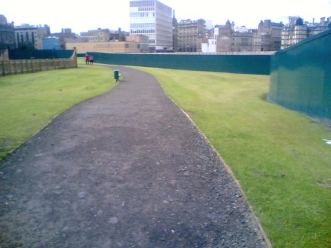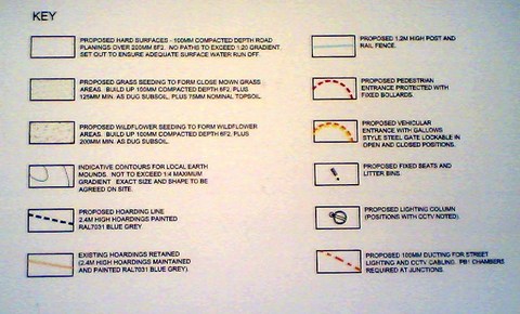 A few folks were enjoying the space, though the the slivers of greenery that bound the concrete crater on two sides are relatively narrow, and are themselves widely intercut with various kinds of hard-standing and (apparently) a turning circle for diggers and so on. The stage, seating area, film screen, garden and picnic area, solar lighting and five viewing areas were not in evidence, though in two places it is possible to peer into the zone through meshed portals in the boundary.