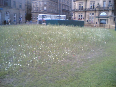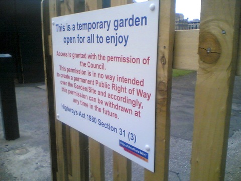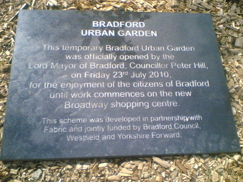 As a responsible citizen and commentator your correspondent felt compelled today to visit the recently opened "Temporary Bradford Urban Garden" which we last reported on in February [1], when plans were about to be unveiled for the opening up of the space.
