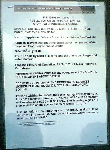 A drinks license application has been posted up for the requisite 28 days so presumably the programme of entertainment is about to begin. Your correspondent will put on his Johnny Greenwash arts-dude outfit and get lined up for some of the public-arts moolah sloshing about, before the last dregs go down the plug hole, and will report back accordingly.