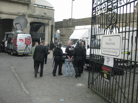Sadly, the Kings Head pub on Halifax Road, Bradford, (a BNP pub) was happy to pocket the fascist pound, allowing sixteen coaches and minibuses to park outside and around the corner of the road, while the football hooligans do what football hooligans do, get pissed. Gangs of these thugs were milling around the pub, singing and chanting in threatening fashion but still the greedy landlord continued to serve them drink.