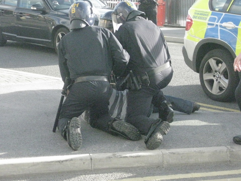 As I stood there, a car bearing a palestinian flag pulled up nearby with a few asian lads inside who got out and waved the flag. The coach opposite then displayed a large israeli flag in its front window, and the EDL supporters inside began hammering on the windows. The main police presence was either winding down or channeling the remaining fascists onto their coaches, and a group of about 6 EDL sprang from the coach and ran at the position we were standing in. With one EDL supporter about 2 metres from myself, fists raised, he was taken out by a baton charge from the right and arrested. Another was arrested and the remainders were taken back to their coach.