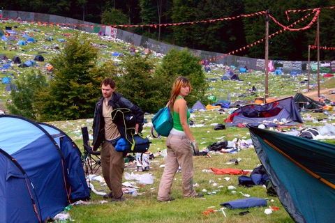 Arriving on site on Monday afternoon, after the festival sight had officially closed, the group encountered what an only be described as apocalyptic scenes. The entire camping area was strewn with litter, debris, tents and other camping equipment stretching as far as the eye can see in all directions. There was barely a patch of grass anywhere where items had not been left by festivalgoers in a depressing display of utterly wasteful behaviour.