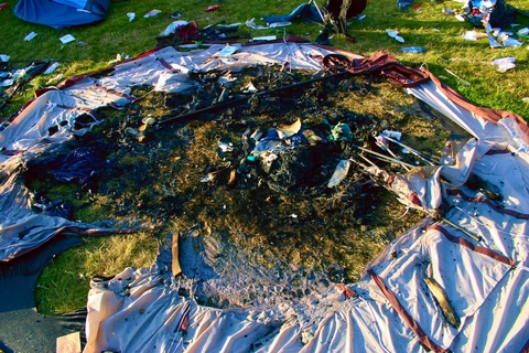 A large proportion of the tents that remained contained open bottles of urine and some even had human faeces inside. Many had been slashed open by people hoping to find valuables within and too lazy to open the zipped door of the tents, meaning that they were then unable to be reused for those in need. Huge mounds of litter were scattered around and were blowing towards the city in the wind, and many tents were simply burned to the ground with aerosol cans and other combustible materials inside. To say that this painted a picture of those attending as disrespectful both to their environment and the needs of others is an understatement. The total purchase cost of that left behind must have run into tens of thousands of pounds, much of it destroyed and so destined for landfill.