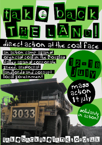 Opencast coal mining in the Douglas Valley is about the ruling class destroying communities for their own financial gain. Its about ecological destruction on a massive scale for capitalism's unquenchable thirst for cheap energy. Its about absentee fat-cat land-lords making millions off land that shouldn't be theirs. Its about morally corrupt local (and national) government putting profit before people. Join us 12-18 July in the Douglas Valley, South Lanarkshire, to build on 20 years of community struggle and four years of direct action against the UK's biggest opencast mining company. It's time to Take Back the Land!