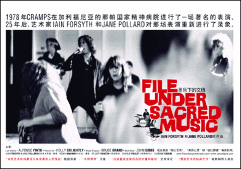 THE FILM Iain Forsyth and Jane Pollard's File under Sacred Music takes as its starting point an infamous video that documents a live performance by The Cramps for the patients at Napa Mental Institute, California, on 13th June 1978. Captured on blurred and grainy black and white film, this unique social document has been swapping hands at record fairs and via the internet since the early eighties. Forsyth and Pollard began by re-enacting that legendary performance in order to film it and remake the rarely seen video document. They consulted closely with a number of mental health arts organisations, before inviting members from Core Arts, Sound Minds and Mad Pride to attend the performance and filming, which was staged on a specially constructed set in the Institute of Contemporary Arts Theatre in London on 3rd March 2003.